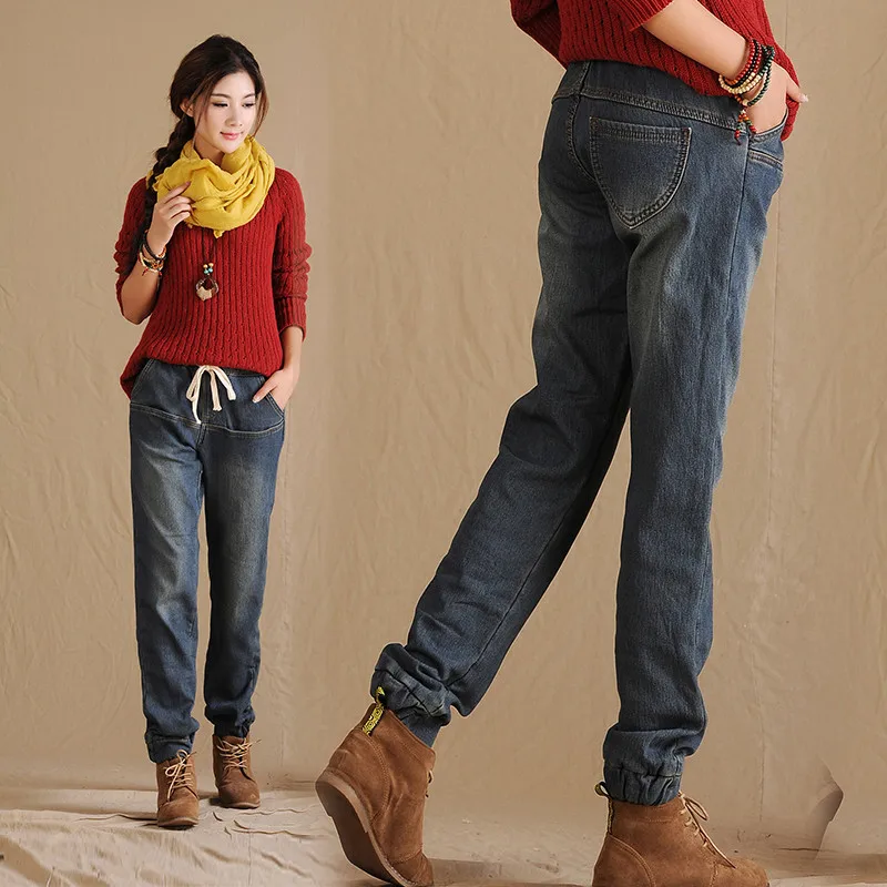 discounted Elastic Waist Winter Jeans Pants Loose Women's Harem Pants Trousers Plus Thick Velvet Warm Straight