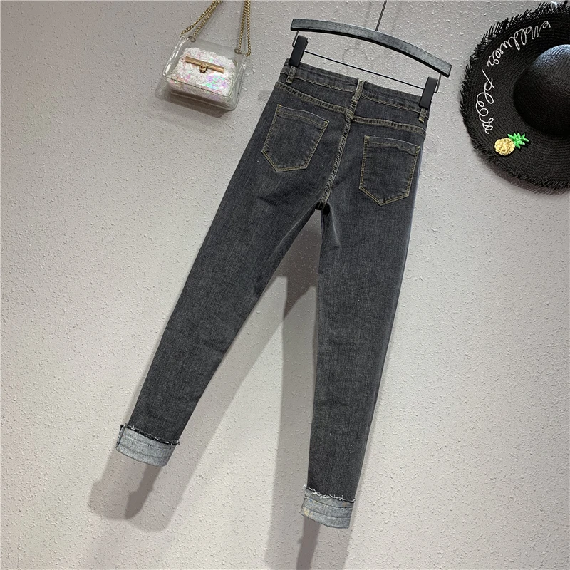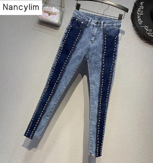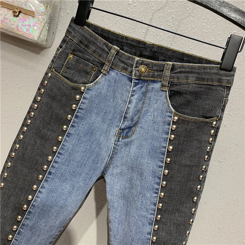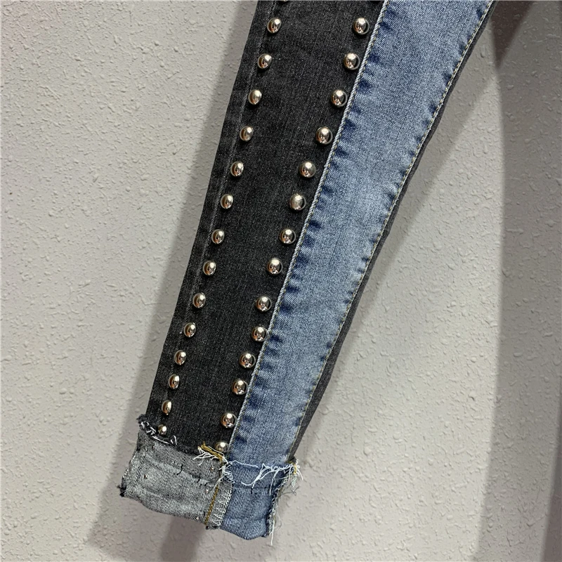 incredible European Fashion Heavy Bead Color Matching Jeans Women Tight Summer Autumn New Skinny Pencil Pants