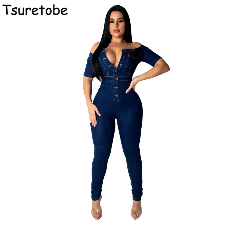 low cost Tsuretobe Off Shoulder Denim Jumpsuit Women Sexy Jeans Bodysuit Female Funk Style Playsuit Girls Ho
