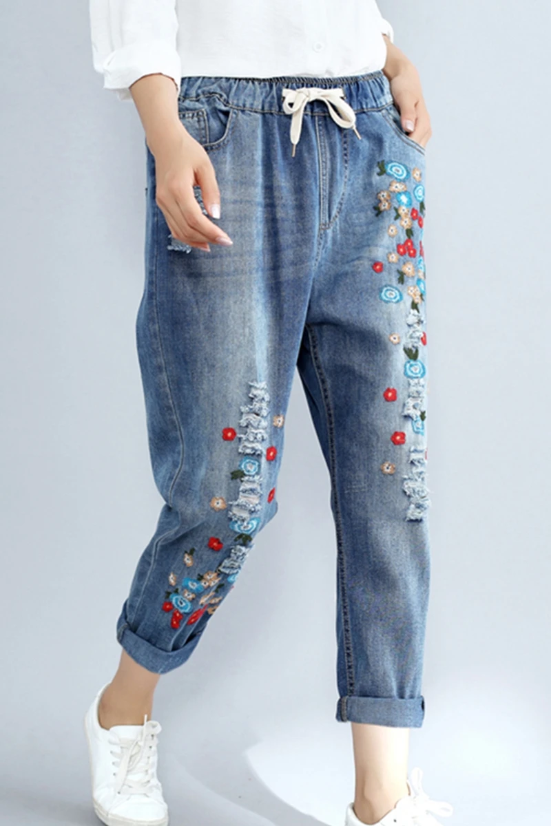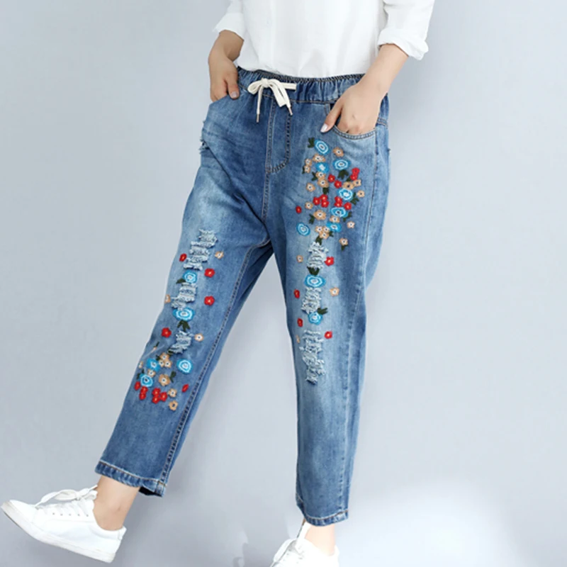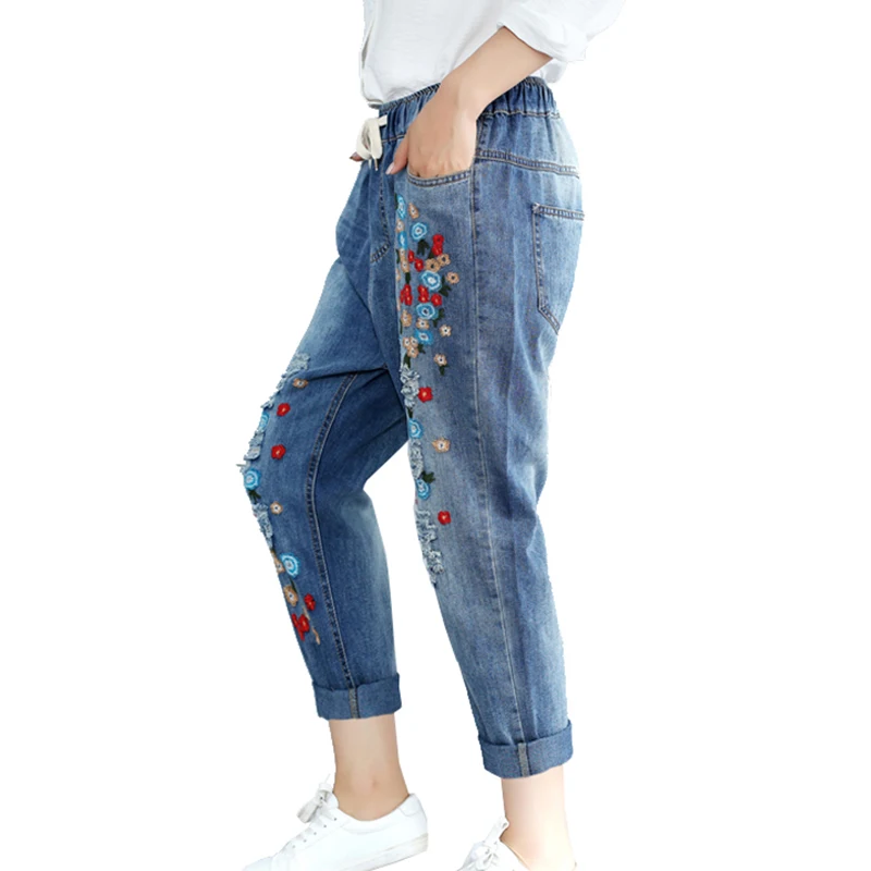 lower price Flowers Women Jeans Large Size Women's Autumn Casual Embroidery Pants Loose Thin Nine Ripped Pants