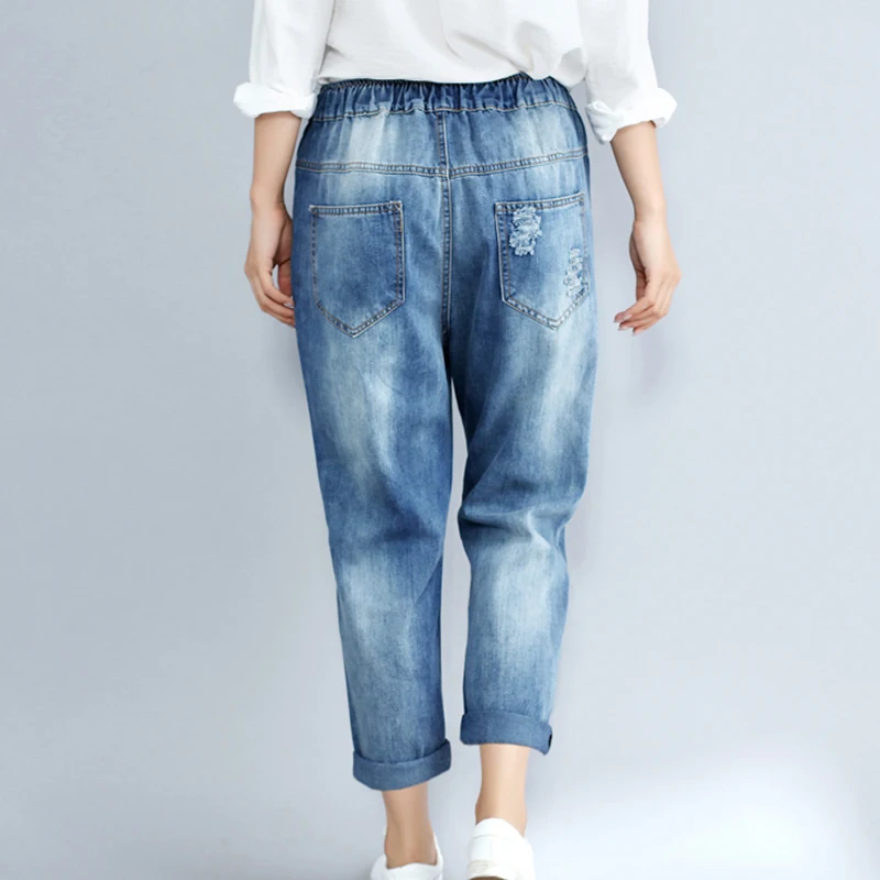 New Flowers Women Jeans Large Size Women's Autumn Casual Embroidery Pants Loose Thin Nine Ripped Pants