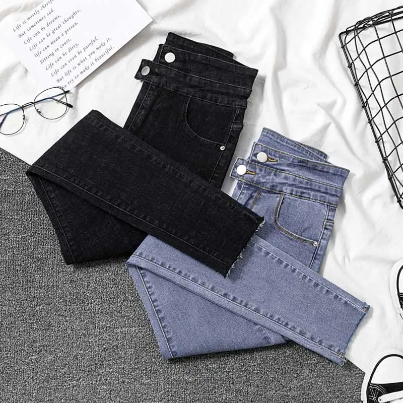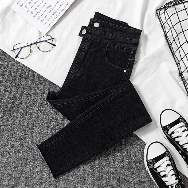 remarkable Korean Women Jeans Stretch Black jeans Female Slim Skinny High Waist Ring Nine Points Feet Pants Do